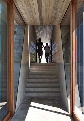 Generous openings work with an operable courtyard to moderate the climate. Out in the elements, and courtesy of a hospitable client, this house brings many people together. It is accessible and relaxed, yet affords privacy and offers constant engagement with its ever changing natural surroundings.
